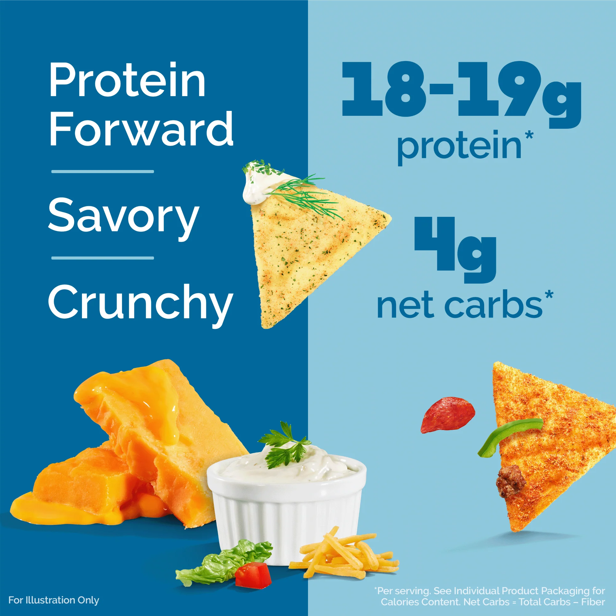 - PROTEIN FORWARD. 18-19g of protein and 4g of net carbs*. They’re the wonderfully crunchy, easy-breezy cheat to support your protein goals while living the tortilla style chip dream.